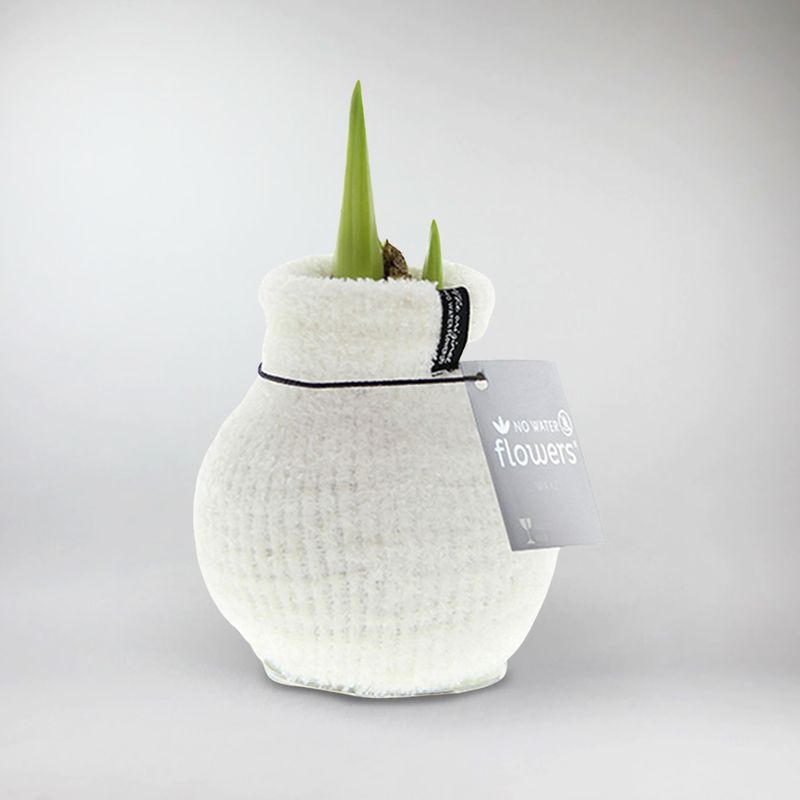 Offrez-vous un bulbe d'Amaryllis enveloppé dans un doux tricot blanc, comme s'il portait un pull de Noël. Posez-le sur une table et admirez ses grandes fleurs en forme de trompette s'épanouir quelques semaines plus tard ! Idéal pour offrir, pour décorer votre intérieur ou comme centre de table festif, il apportera une touche chaleureuse et cosy à votre décoration.