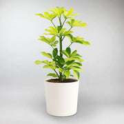 Le Schefflera ‘Melanie’ est une plante-ombrelle robuste aux folioles brillantes et arrondies, et au port dressé et vigoureux. Facile d'entretien, elle est idéale en pot ou sur une table. Placez-la dans un endroit lumineux, à l'abri du soleil direct, et arrosez-la lorsque le terreau en surface est sec. Elle apprécie une brumisation occasionnelle, mais se plaît dans une atmosphère intérieure classique. Un choix sûr pour apporter une touche de verdure à votre intérieur.